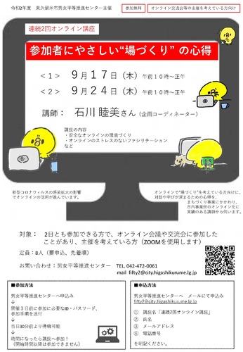 9月1日(火曜日)からメールで東久留米市男女平等推進センターへ。(氏名・電話番号を記載してください。)