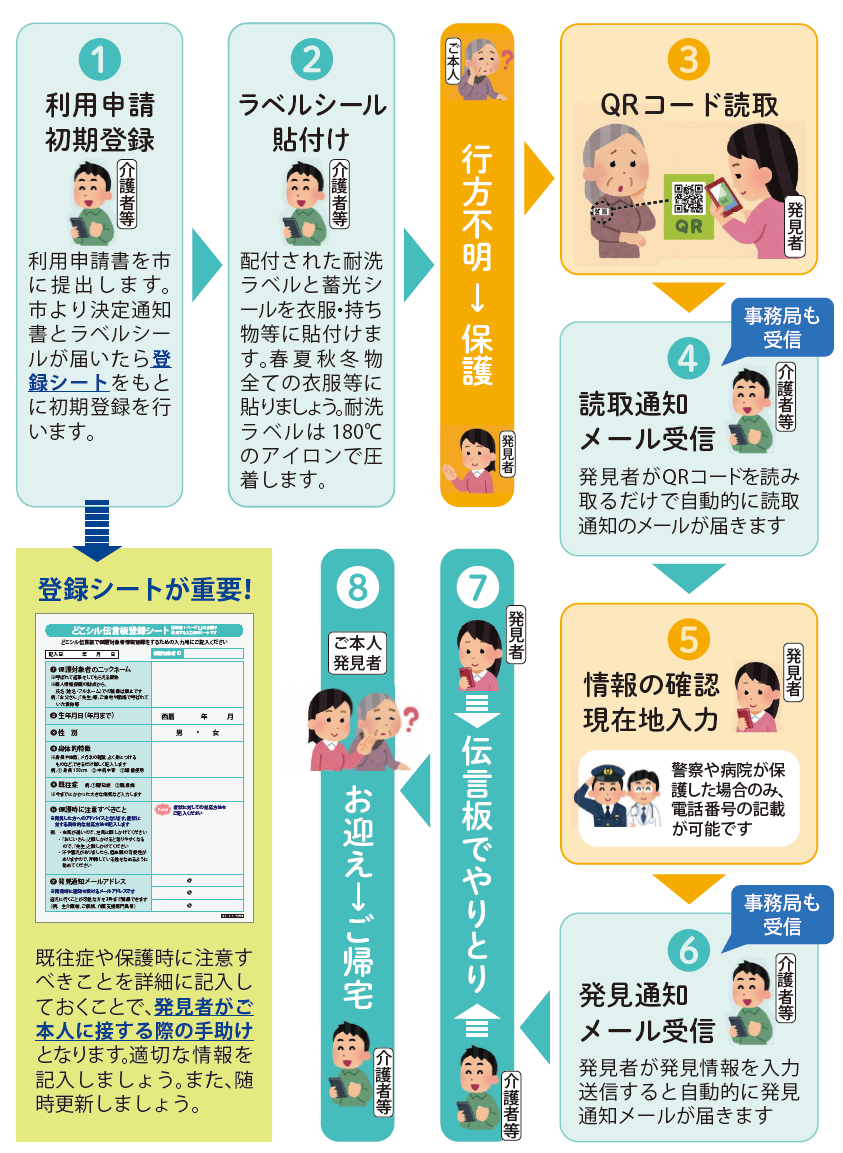 認知症等の症状により迷い人となった認知症高齢者等(若年性認知症の方を含みます)を早期に発見及び保護するための事業です。