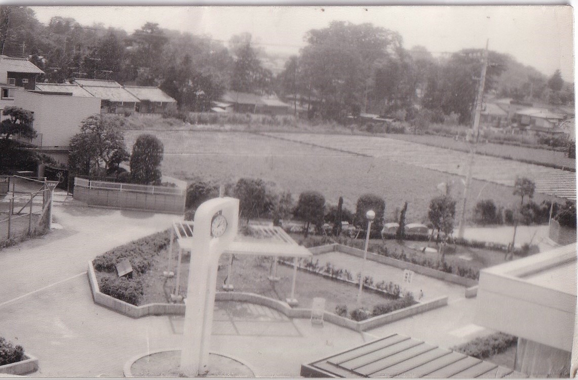 1980年に設置された時計。正面奥付近の雑木林は神明社